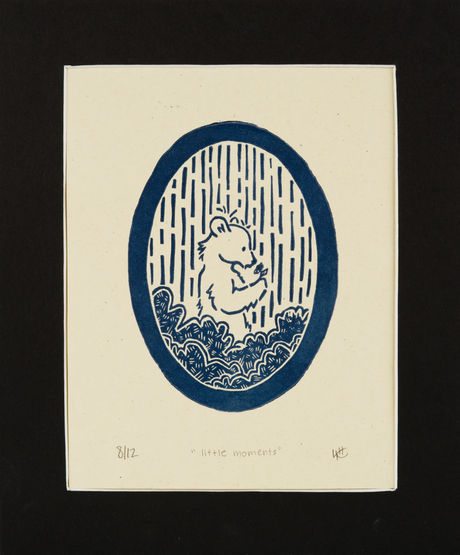This is the first linoleum print that I have done. The bear pauses in the rain to look at the flower, representing how we should pause and enjoy the little moments. First, I sketched in Procreate and then transferred the image onto a linoleum block. After the image was transferred, I began carving the image. The next and final step is to soak the paper, ink the block, and press the two together. The image dries and you are left with a beautiful, clean print. This piece won 3rd place at the John Brown University student works show, in the printmaking category (2026).